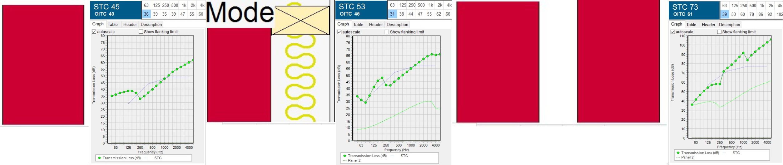 Untuk lebih mudah memahaminya, kita bisa melihat dari analisis dari nilai insulasi bunyi (Sound Transmission Class) dari masing-masing struktur dinding. Pada gambar dapat dilihat perbandingan nilai STC dari sebuah dinding bata biasa, dinding bata dengan rangka kayu dan diisi mineral wool, serta dinding dobel yang memiliki celah udara 5cm. Dinding dobel memiliki nilai STC yang tertinggi (73dB) karena memiliki massa yang terbesar dan sistem dekopling dengan celah udara, sedangkan dinding bata dengan rangka kayu diisi mineral wool (53dB) memiliki penambahan STC sebesar 8dB dari dinding bata biasa. Jika anda memiliki dana lebih dan ruang sisa yang cukup besar maka dinding ganda akan jauh lebih menghambat bunyi keluar ruang (penambahan STC sebesar 28dB).