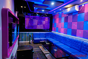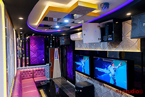 Desain interior karaoke room ini memiliki tema yang manis karena didominasi oleh warna ungu dan pink. Supaya tidak terasa menjenuhkan maka ruang karaoke ini mendapat tambahan warna biru. Dinding karaoke room dipenuhi dengan absorber yang ditutup dengan kain.