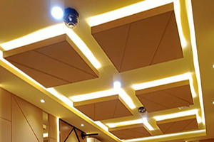 Pada plafonnya dipasang panel absorber dengan dua macam bentuk: persegi panjang dan persegi.