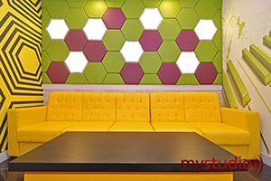 Pada dinding di belakang sofa terdapat dekorasi berbentuk hexagon berwarna-warni. Dekorasi tersebut merupakan padded wall panel yang berfungsi sebagai panel absorber untuk mengurangi gaung di dalam ruang karaoke.