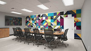 Padded wall panel tersebut berbentuk persegi, persegi panjang, dan segitiga dengan ukuran-ukuran berbeda membuat dinding meeting room terlihat tidak monoton.