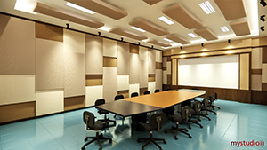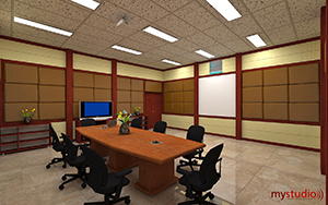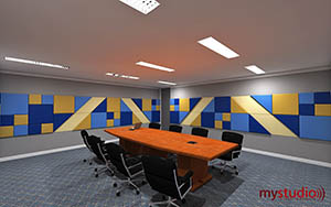 Meeting room minimalist juga perlu diberi interior akustik karena ruangan yang minimalis didominasi oleh frekuensi rendah sehingga frekuensi rendah harus dikurangi. Berikut contoh interior akustik meeting room minimalist.